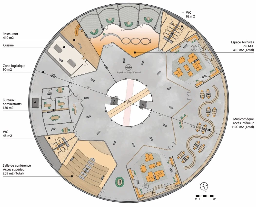 L’ensemble du parking, réparti sur sept niveaux, est repensé dans une logique de circulation fluide et de progression sensorielle. Le niveau -3, intitulé “Inspiration Zone”, est développé plus en détail : il regroupe une musicothèque, une salle de conférence et les archives du festival. Cette zone, à dominante orange, incarne la créativité et la chaleur — une teinte choisie pour stimuler la curiosité et encourager la découverte.