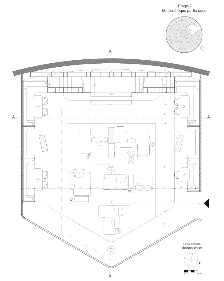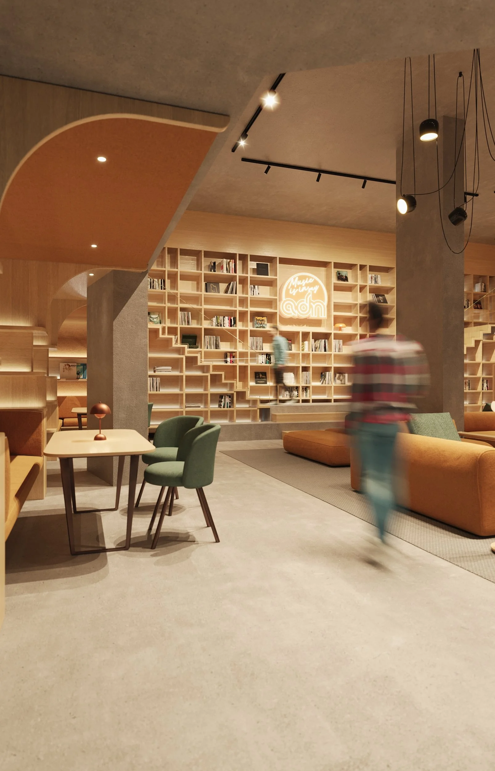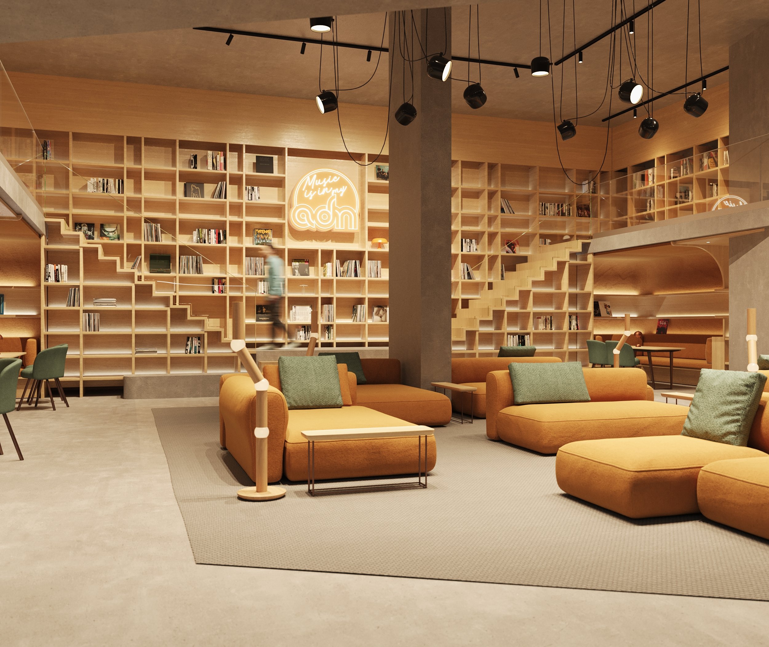 Cœur du projet, la musicothèque symbolise l’ADN du Hub : un lieu où la musique ne se limite pas à l’écoute, mais se lit, se partage et se vit. L’espace s’organise autour d’une trémie centrale qui relie deux niveaux visuellement et spatialement. Cette ouverture crée une continuité et une respiration verticale, tout en renforçant la sensation d’un espace vivant et connecté.